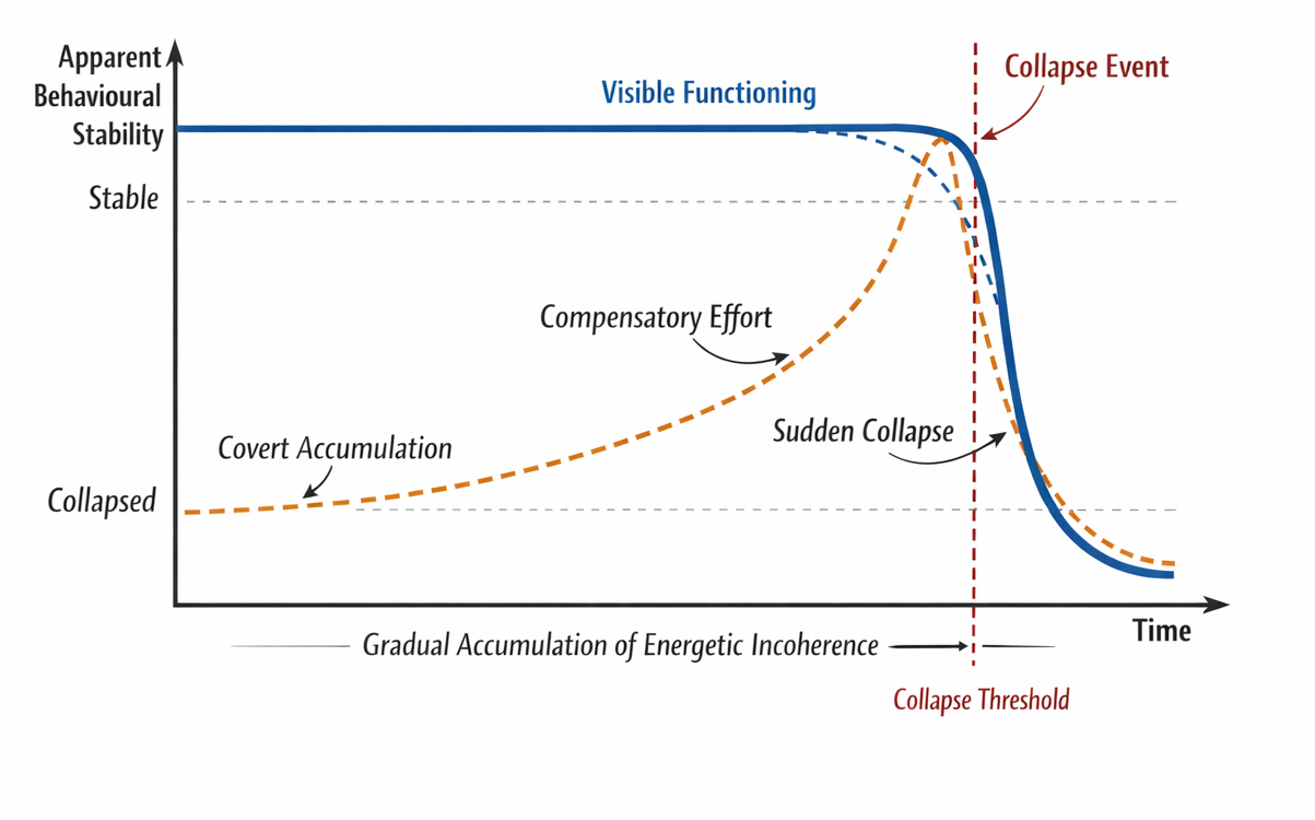 This diagram shows how systems can remain behaviourally coherent while becoming structurally fragile. Once compensatory capacity is exceeded, reorganisation occurs rapidly, giving the appearance of sudden breakdown despite gradual energetic deterioration.